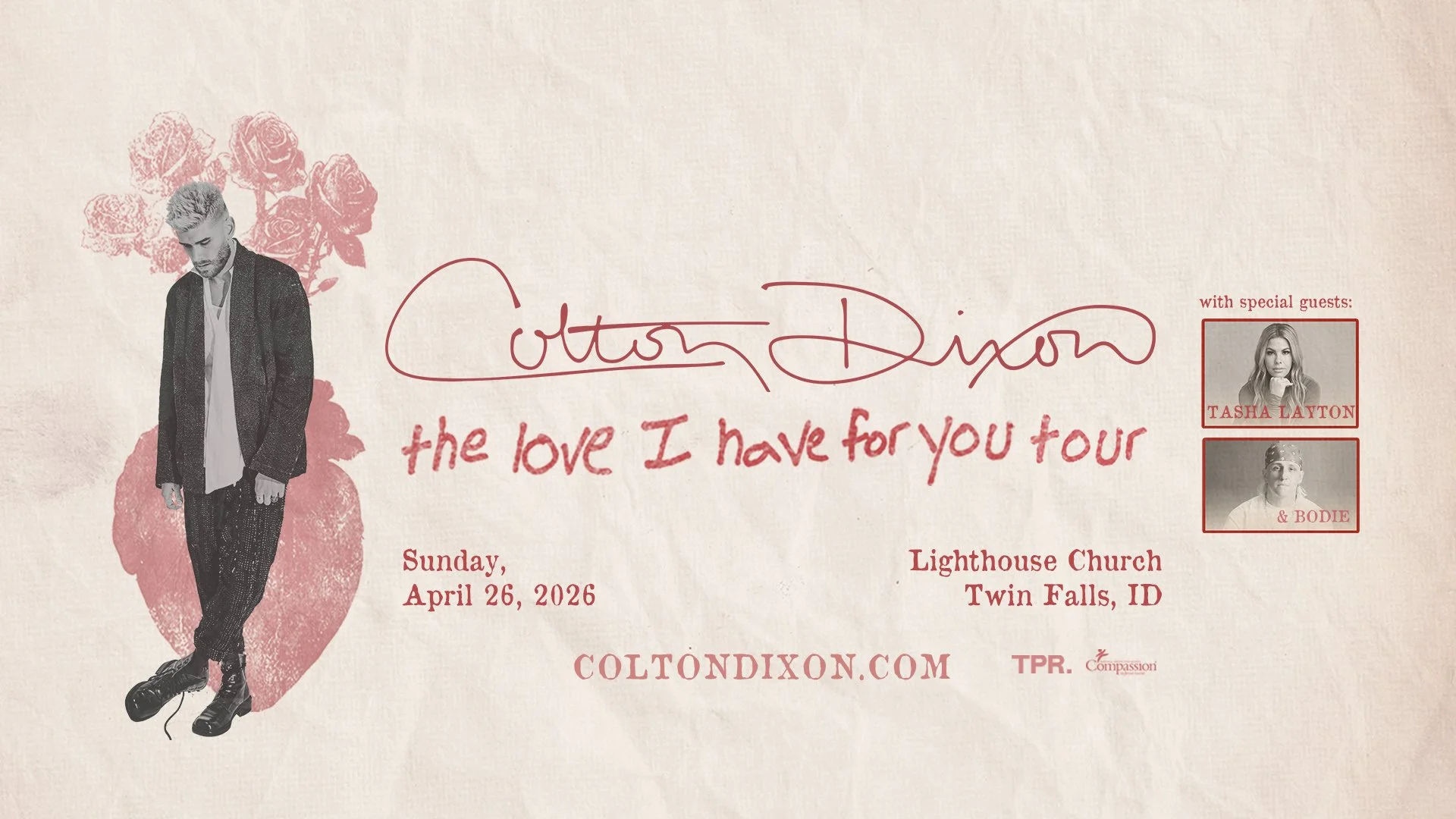 Just Announced! Colton Dixon is bringing his "The Love I Have For You Tour" to Lighthouse Church on April 26th! Joined by special guests Tasha Layton and Bodie, this is sure to be a night you will not want to miss! Tickets go on sale soon!
