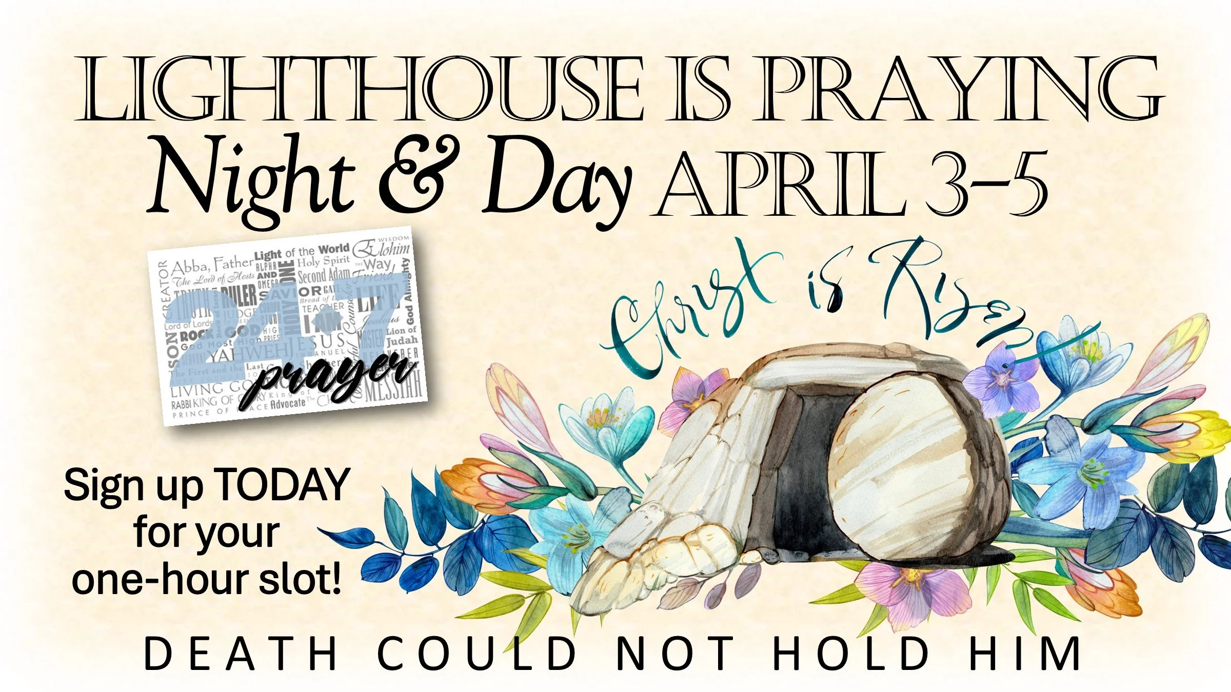 Sign-up sheets are on the wall by the Prayer Room. Prayer slots fill up quickly so get signed up today!